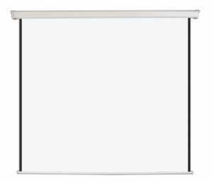 Manual spring retraction wall screen for wall or ceiling mounting.