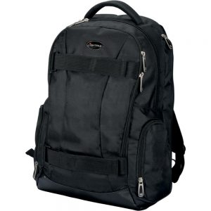 The modern unisex backpack is made of black polyester with trendy printing and embroidery. The large main compartment has zipped pockets at both sides and at the front, plus two adjustable straps with hook and loop. The padded laptop compartment at the front is opened by a side zipper and the water resistant bottom makes this backpack multifunctional and individual. The padded adjustable shoulder straps as well as a padded back and handle make for comfortable carrying. Black. 330x180x450mm.